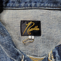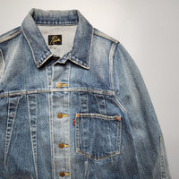 Needles - Darts Denim Jacket Size 2 (JPN) fits US Small Gently Used Product Information: NEEDLES denim jacket is an authentic item tailored with special patterns such as darts.The perfection of the distressed finish is amazing.100 % COTTON 12oz denim with a vintage look.Darts are applied in various places, and the neck has depth and the front. The position of the pockets and other distinctive details have been incorporated into the jacket.And the silhouette with a slight bulge due to the darts is very comfortable to wear, so unlike an authentic G-jean, it seems like you can wear it without hesitation.Due to the unique silhouette, it can be worn from any angle. A dart jean jacket that looks three-dimensional when you look at it. Use it as an outerwear in spring, early summer, and fall , and wear it under your coat when it's cold.