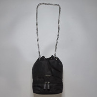 Prada - Vela Nero Bucket Bag - Small Gently Used Very Good Condition Minor Sign of Use * Silver-Tone Hardware Chain is Aftermarket Product Information: Prada small bucket bag in black nylon with a top drawstring closure, a signature triangle logo plaque in silver metal hardware, and a bottom zip compartment. Dimensions = 8" x 9.5" x 4" Material = Nylon Hardware = Silver, Black