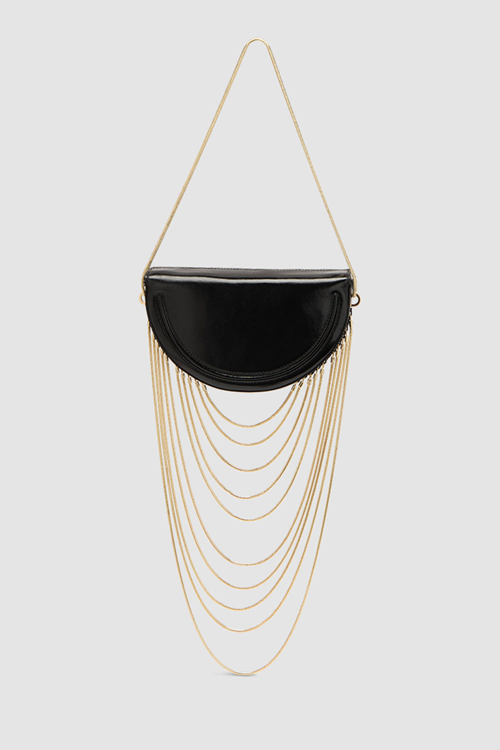 A structured evening crescent bag with a double chain strap, worn crossbody, on the shoulder, or as a clutch. Features piping detail in the front, chain embellishments, magnetic closure, and a micro suede-lined interior with a branded leather pocket. DETAILS - Evening crescent bag - Option to wear it as a crossbody or shoulder bag; or as clutch - Double chain strap - Structured construction - Magnetic closure - Piping detail at the front - Multiple chain embellishments - Small interior branded leather patch pocket 100x 60mm (credit card size) - Micro suede lining - Made in Bulgaria SIZE AND FIT - Height: 12,5 cm - Width: 23 cm - Depth: 3 cm - Handle Drop: - Strap Length: 63 cm (for shoulder bag), 126cm (for crossbody)