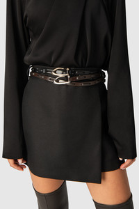 Thin semi patent and nappa leather adjustable belt with an interlaced construction, finished with a custom metal hook buckle closure. DETAILS - Thin leather adjustable belt - Interlaced leather construction - Custom metal hook buckle closure - Made in Bulgaria SIZE AND FIT XS (65 cm) S (75 cm) M (85 cm) L (95 cm) XL (105 cm) Width: 12 mm