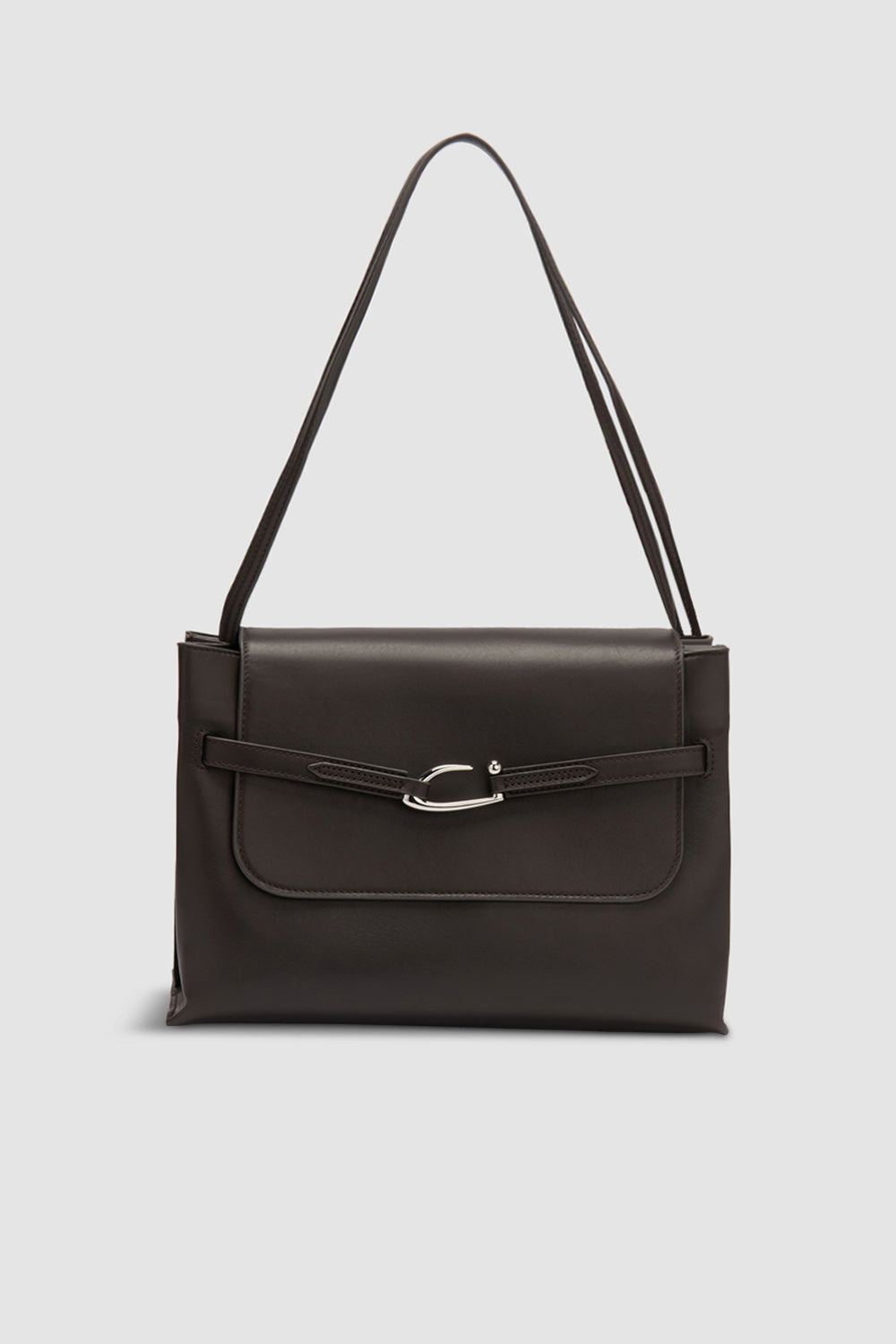 Soft nappa leather tote bag featuring an adjustable belt detail with a custom metal buckle. Designed for versatility, it can be worn over the shoulder or crossbody. The interior includes two large compartments, a middle pocket, and a branded leather patch pocket. Fits a 13-inch laptop. Finished with micro suede lining. DETAILS - Soft tote bag; flap bag - Leather shoulder straps - Option to wear it crossbody - Two large interior compartments and one middle pocket - Adjustable belt detail with custom metal buckle - Large interior branded leather patch pocket 183x90mm - Micro suede lining - Made in Bulgaria SIZE AND FIT - Height: 21 cm - Width: 30 cm - Depth: 12 cm - Handle Drop: 25 cm - Strap Length: 70 cm