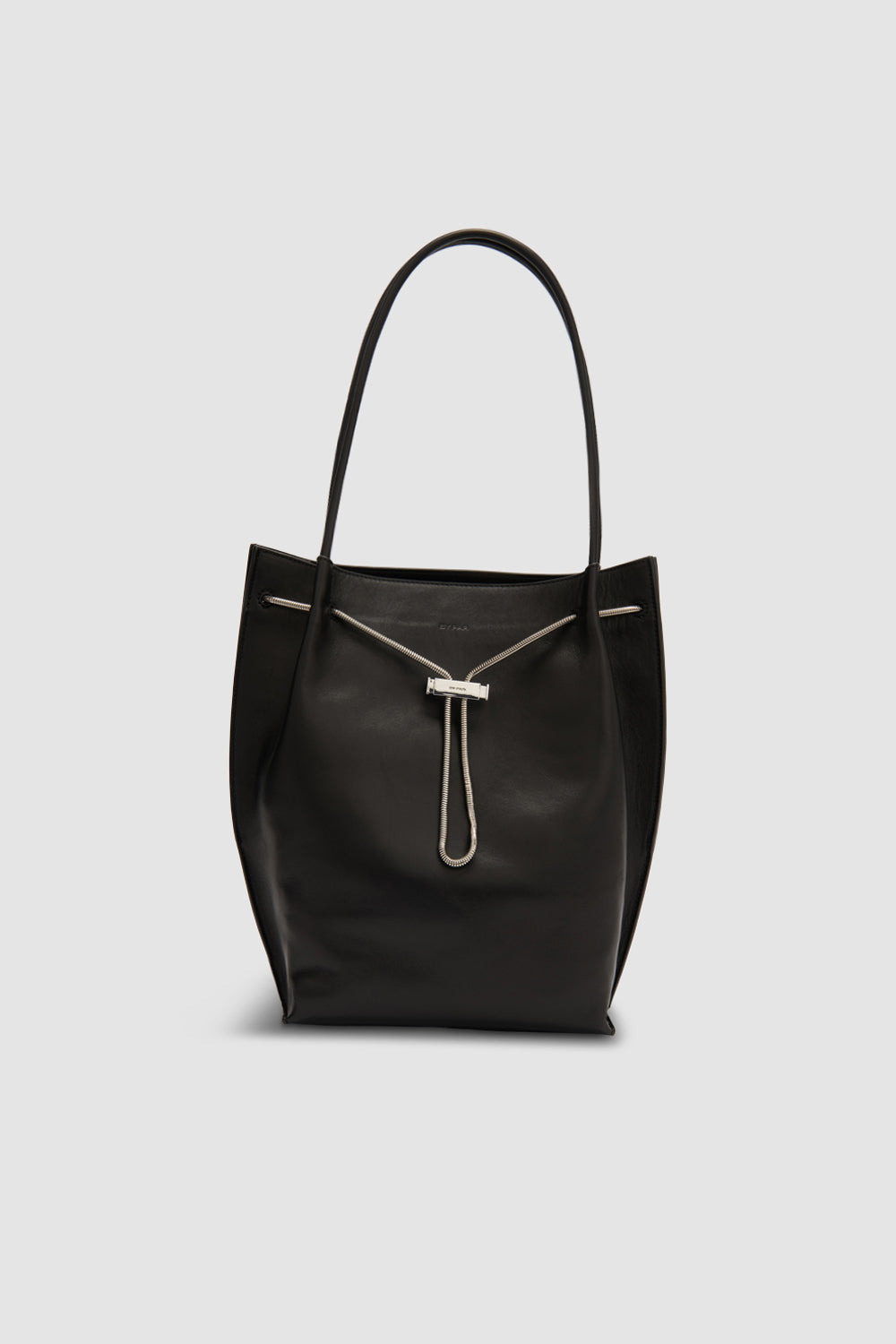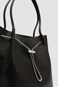 Soft tote bag featuring a wide base and tubular leather shoulder straps. Designed with an adjustable chain and custom toggle closure, accented by branded metal hardware. Interior includes a large branded leather patch pocket and is lined with soft micro suede for a refined finish. DETAILS - Soft tote bag with wide base - Tubular leather shoulder straps - Adjustable chain and custom toggle closure - Branded metal hardware - Large interior branded leather patch pocket 183x90mm - Micro suede lining - Made in Bulgaria SIZE AND FIT - Height: 32 cm - Width: 22 cm - Depth: 11 cm - Handle Drop: 22 cm - Strap Length: 53.5 cm
