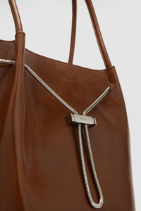 Soft tote bag featuring a wide base and tubular leather shoulder straps. Designed with an adjustable chain and custom toggle closure, accented by branded metal hardware. Interior includes a large branded leather patch pocket and is lined with soft micro suede for a refined finish. DETAILS - Soft tote bag with wide base - Tubular leather shoulder straps - Adjustable chain and custom toggle closure - Branded metal hardware - Large interior branded leather patch pocket 183x90mm - Micro suede lining - Made in Bulgaria SIZE AND FIT - Height: 32 cm - Width: 22 cm - Depth: 11 cm - Handle Drop: 22 cm - Strap Length: 53.5 cm