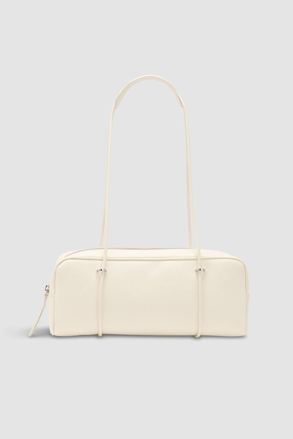 Washed leather baguette bag with oversized soft construction and tubular leather shoulder straps. Features a zip closure and a spacious interior compartment, complemented by a small branded leather patch pocket (credit card size). Finished with micro suede lining. DETAILS - Baguette bag; oversized soft construction - Tubular leather shoulder straps - Zip closure - One big interior compartment - Small interior branded leather patch pocket 100x 60mm (credit card size) - Micro suede lining - Made in Bulgaria SIZE AND FIT - Height: 12,5 cm - Width: 31 cm - Depth: 10 cm - Handle Drop: 27 cm - Strap Length: 67 cm