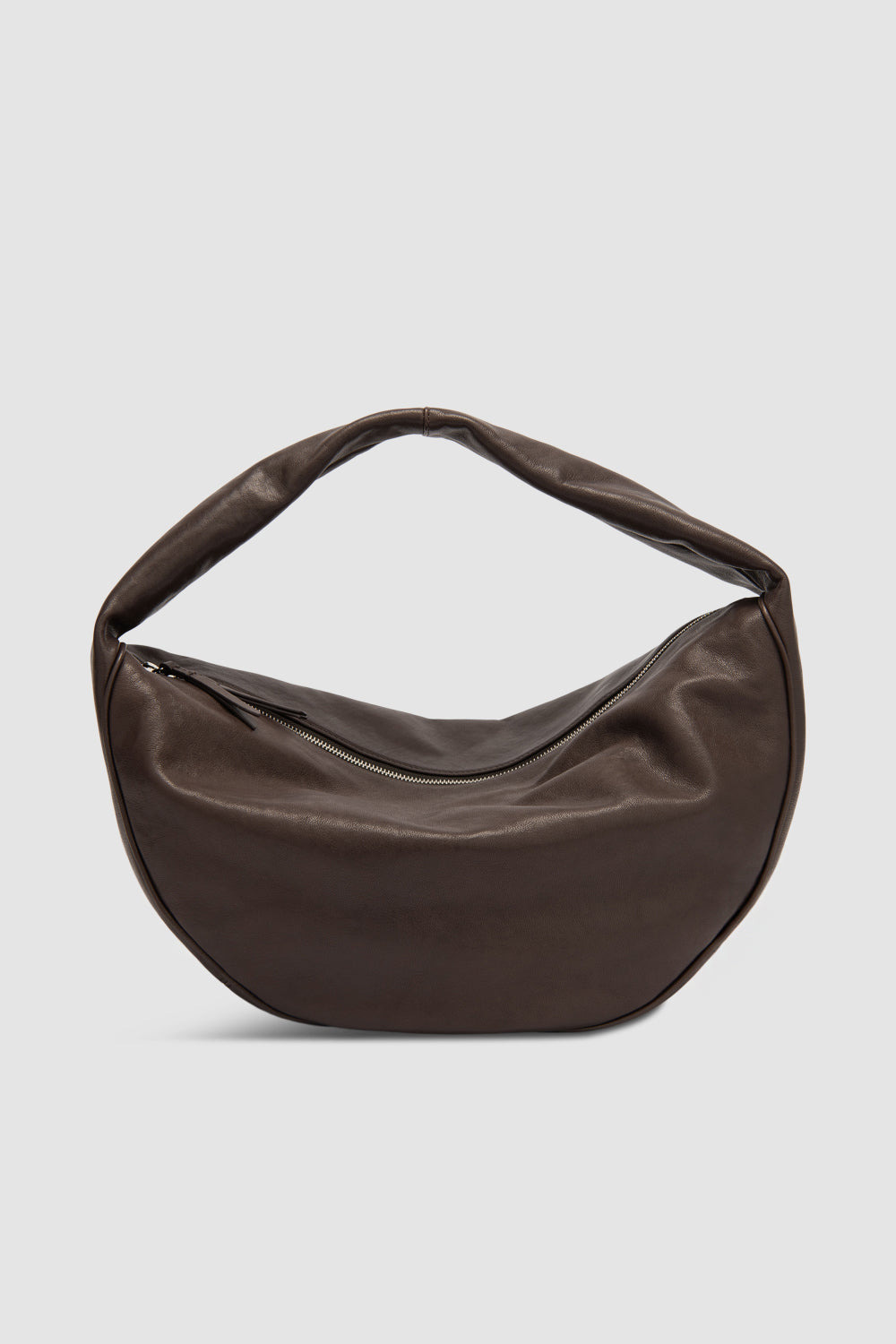 Washed leather shoulder bag with a slouchy crescent silhouette, single soft wide shoulder strap and finished with a zip closure. Features black cotton lining, an inside pocket, and a raised logo patch. DETAILS - Shoulder bag - Slouchy crescent silhouette - Single soft wide shoulder strap - Zip closure - Black cotton lining - Inside pocket - Vegan options in hand-knitted velvet - Inside Patch 63x56mm with 45mm raised logo - Made in Bulgaria SIZE AND FIT - Handle drop: 18 cm - Strap: 48 cm - Width: 40 cm - Height: 25 cm - Depth: 15 cm