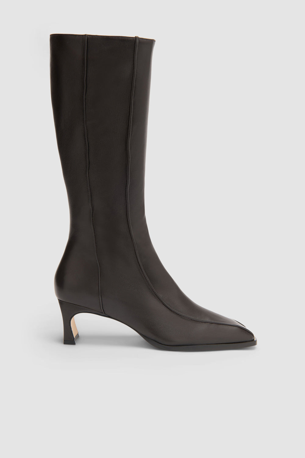 Fitted lamb nappa leather knee-high boot with internal side zip and elasticated topline panel. Features a sculpted 5.5cm leather-covered block heel, decorative vertical stitchlines, an elongated square toeshape, and a leather sole. DETAILS - Leather knee high boot - Fitted - Internal side zip closure - Internal elasticated panel at topline - Sculpted leather-covered block heel - Heel height: 5,5 cm - Decorative vertical stitchlines - Elongated square toeshape - Leather sole - Made in Bulgaria SIZE AND FIT Fits true to size. Italian/European sizing.