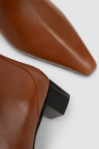 Tan distressed leather knee-high boot featuring a stacked 3.5cm block heel and a pointed square toe. Free of closures for pull-on ease. DETAILS - Stacked block heel - Heel height: 3.5 cm - Pointed square toe - Pull-On - Made in Portugal SIZE AND FIT Fits true to size. Italian/European sizing.