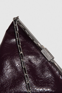 Creased leather top-handle bag with a pyramid construction and a detachable chain strap for versatile wear. Features a silver-toned folding frame, clasp fastening with BY FAR logo, inside zip pocket, and synthetic suede lining. Made from LWG-certified leather. DETAILS - Leather top-handle bag - Pyramid construction - Detachable chain strap for multiple ways to wear - Silver-toned kiss-shaped frame that folds for enhanced functionality - Clasp fastening with BY FAR logo - Inside zip pocket - Synthetic suede lining - Offered in creased leather for a soft, sculpted look - Made in Bulgaria SIZE AND FIT Width: 25 cm Height: 20 cm Depth: 26 cm 53 cm chain