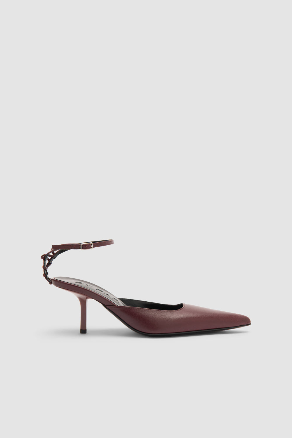 Nappa leather pump with an elongated pointed toeshape and square topline, featuring a tonal painted 7cm thin heel and adjustable ankle strap. Finished with a laced back detail and a leather sole. DETAILS - Leather pump - Tonal painted thin heel - Heel height: 7cm - Adjustable ankle strap - Laced back detail - Elongated pointed toeshape - Square topline - Leather sole - Made in Portugal SIZE AND FIT Fits true to size. Italian/European sizing.