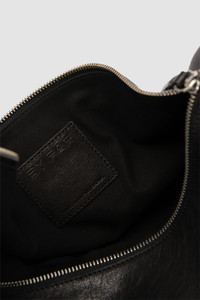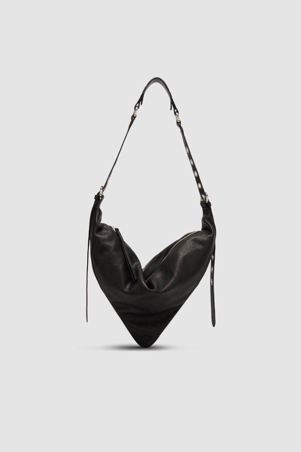 Soft triangular leather bag featuring adjustable leather straps for shoulder or crossbody wear. Finished with a zip closure, divided main compartment, bottom belt detail, metal hardware, and a branded leather patch inside, all lined with micro suede. DETAILS - Soft triangular construction - Adjustable leather straps - Option to wear it as shoulder bag or as a crossbody bag - Zip closure - Big interior compartment divided in two halves - Belt detail across the bottom - Metal hardware - Small interior branded leather patch 63x 56mm - Micro suede lining - Made in Bulgaria SIZE AND FIT - Height: 35 cm - Width: 64 cm - Handle Drop: 57 cm - Strap Total Length: 146 cm