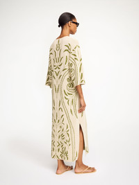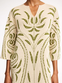 With inspiration from tranquil gardens, the Agneto dress is covered in embroidered grasshopper green garden vines. The close-knitted maxi design has a deep V-neck, wide sleeves and high slits on each side. Wear on its own or with the matching Jorith trousers. - Loose fit - Model is 179 cm and is wearing a size S - V-neck - High slits - Embroidered pattern - Contains LENZING™ ECOVERO™ viscose fibers - "LENZING™ and ECOVERO™ are trademarks of Lenzing AG DETAILS COLOUR Garden Jacquard COMPOSITION 87% viscose (lenzing (TM) ecovero (TM) ), 13% polyamide CARE Delicate machine wash at 30°c PRODUCT CODE Style #103472QJ2