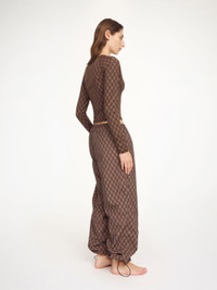 With inspiration from classic sportswear, the Alban trousers are equally wearable for weekdays, weekends – and workouts. The parachute design is completed with a drawcord waist, zipped pockets and cinchable shock cords. Notice its monogram motif. - Loose fit - Model is 175 cm and is wearing a size 36 - Drawcord waist - Zipped side pockets - Zipped back pocket - Cinchable shock cords - Half lined - Monogram motif DETAILS COLOUR Dark Mahogany COMPOSITION 100% polyamide recycled CARE Delicate machine wash at 30°c PRODUCT CODE Style #1037661K2