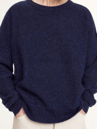 Crafted from a lightweight blend of wool and mohair, with a touch of stretch for comfort, this knitted sweater is cut for a relaxed, slightly oversized fit and has defining ribbed trims. - Oversized fit - Model is 177 cm and is wearing a size S - This product contains 34% RWS wool and 34% RMS mohair, certified by Control Union, CU 877742. Responsible Mohair Standard (RMS) & Wool standard (RWS) verifies animal welfare and land management requirements and tracks it from the source to the final product. - Ribbed trim DETAILS COLOUR Night Sky COMPOSITION 34% wool, 34% kidmohair, 27% polyamide, 5% elastane CARE Delicate machine wash at 30°c PRODUCT CODE Style #1017572Q4