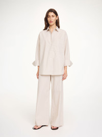 Add an element of practicality to your transseasonal wardrobe with the Cabello trousers. Inspired by classic cargo styles, this wide-leg silhouette is reimagined with a streamlined finish and a snug elastic waistband for effortless wear. Style with the season’s ladylike uppers to strike a playful yet poised balance. - Loose fit - Model is 175 cm and is wearing a size 36 - Elastic waistband - Wide legs DETAILS COLOUR Old Beige Thin Stripe COMPOSITION 100% cotton organic CARE Wash at 30°c PRODUCT CODE Style #104026QG4