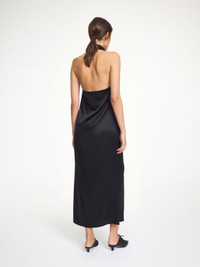 Draping the body in a way that feels almost intimate, the Charmie dress is made in a delicate satin mix. Falling from a halterneck to a deep draped neckline and with a low back, the straight maxi silhouette is made for the after-hours. - Regular fit - Model is 178 cm and is wearing a size 36 - Draped halterneck - Low back - Straight silhouette - Side slit - Eastman Naia™ is a cellulosic fibre produced from responsibly sourced wood pulp. It is quick drying, biodegradable, supremely soft and comfortable to wear DETAILS COLOUR Black COMPOSITION 85% acetate, 15% polyester CARE Delicate machine wash at 30°c PRODUCT CODE Style #103593050
