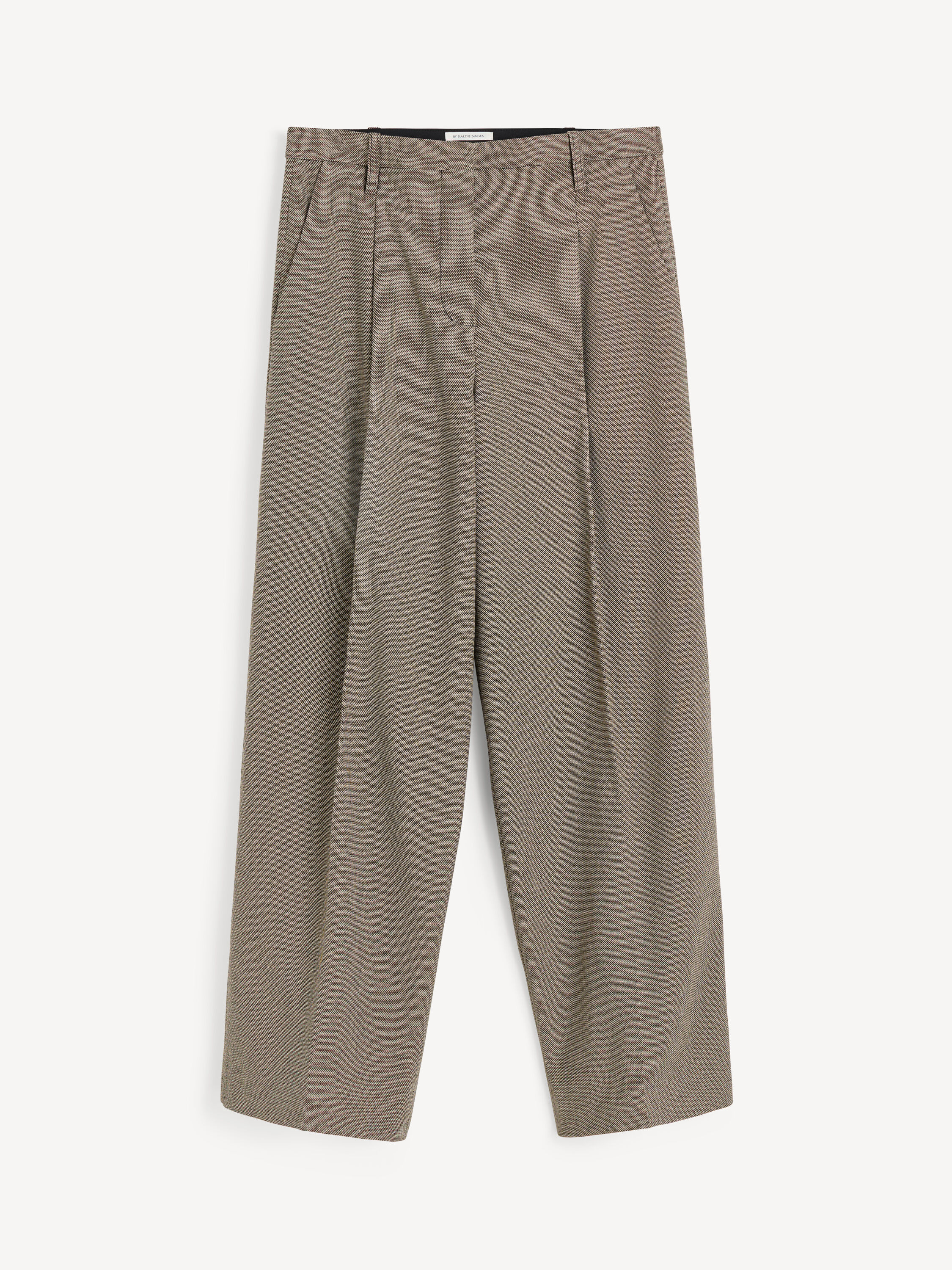 Made for the office hours – and beyond – the wide-leg Elsa trousers are both timeless and effortless. Inspired by the tailored classic, they’re completed with a zip, button and hook closure, belt loops, side- and back pockets, and creases both front and back. - Loose fit - Model is 177 cm and is wearing a size 36 - High waisted - Zip, button and hook closure - Belt loops - Side pockets - Back pockets - Front and back crease DETAILS COLOUR Mixed Weave Beige COMPOSITION 69% polyester, 29% viscose, 2% elastane CARE No Wash PRODUCT CODE Style #103456QW1