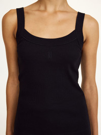 A versatile minimalistic tank top – such as the Frillio design – will slot right into any modern woman’s wardrobe. Made in an organic cotton mix with stretch, the easy silhouette falls from wide straps and has a low round neckline. Notice the small, embroidered monogram on its front. - Slim fit - Model is 175 cm and is wearing a size S - Wide straps - Low neckline - Embroidered monogram DETAILS COLOUR Black COMPOSITION 98% cotton organic, 2% elastane CARE Wash at 30°c PRODUCT CODE Style #103107050