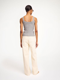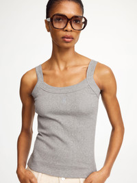 A versatile minimalistic tank top – such as the Frillio design – will slot right into any modern woman’s wardrobe. Made in an organic cotton mix with stretch, the easy silhouette falls from wide straps and has a low round neckline. Notice the small, embroidered monogram on its front. - Slim fit - Model is 179 cm and is wearing a size S - Wide straps - Low neckline - Embroidered monogram DETAILS COLOUR Grey Melange COMPOSITION 98% cotton organic, 2% elastane CARE Wash at 30°c PRODUCT CODE Style #103107T5M
