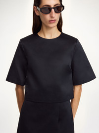 Soothing in hue and timeless in silhouette, the Hania top will fit right into your year-round edit. The slightly cropped T-shirt silhouette closes with a zipper and hook in the back. Pair with the Hermie mini skirt. - Regular fit - Model is 175 cm and is wearing a size 36 - Cropped silhouette - Round neckline - Zip and hook closure DETAILS COLOUR Black COMPOSITION 59% polyester, 41% cotton organic CARE Delicate machine wash at 30°c PRODUCT CODE Style #103038050
