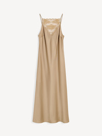 Add a sense of modern bohemia to your year-round wardrobe with the Libbie dress. The maxi design is made in satin and decorated with a delicate lace at the chest. Layer underneath the Pinlos cape for festivities, and it will become a favourite for seasons – and years – to come. - Regular fit - Model is 177 cm and is wearing a size 36 - Lace detailing - Straight silhouette - Adjustable straps - Eastman Naia™ is a cellulosic fibre produced from responsibly sourced wood pulp. It is quick drying, biodegradable, supremely soft and comfortable to wear DETAILS COLOUR Kelp COMPOSITION 85% acetate, 15% polyester CARE Delicate machine wash at 30°c PRODUCT CODE Style #1034031Y7