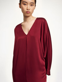 You will reach for this ankle-gracing design repeatedly across seasons for all types of soirees. With its billowing dolman sleeves, V-neck and high front slit, the Lucina dress is elegant and alluring. The tranquil silhouette makes it ideal to dress up or down depending on your mood. - Loose fit - Model is 177 cm and is wearing a size 36 - Eastman Naia™ is a cellulosic fibre produced from responsibly sourced wood pulp. It is quick drying, biodegradable, supremely soft and comfortable to wear - Ankle-length - Front slit - V-neck - Dolman sleeves - Unlined DETAILS COLOUR Cabernet COMPOSITION 76% acetate, 24% polyester CARE Delicate machine wash at 30°c PRODUCT CODE Style #1038085U7