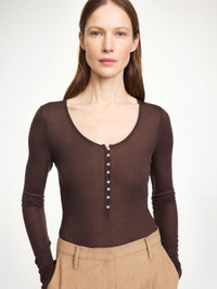A textbook layering piece all-year around, the Majka bodystocking is made in a semi-sheer wool mix. The simple silhouette is decorated with small front buttons. It closes neatly with click buttons between the legs. - Slim fit - Model is 177 cm and is wearing a size S - Click button closure - Front buttons - Round neckline - Sheer fabrication DETAILS COLOUR Coffee Brown COMPOSITION 80% modal, 20% wool CARE Hand wash PRODUCT CODE Style #1032841BM