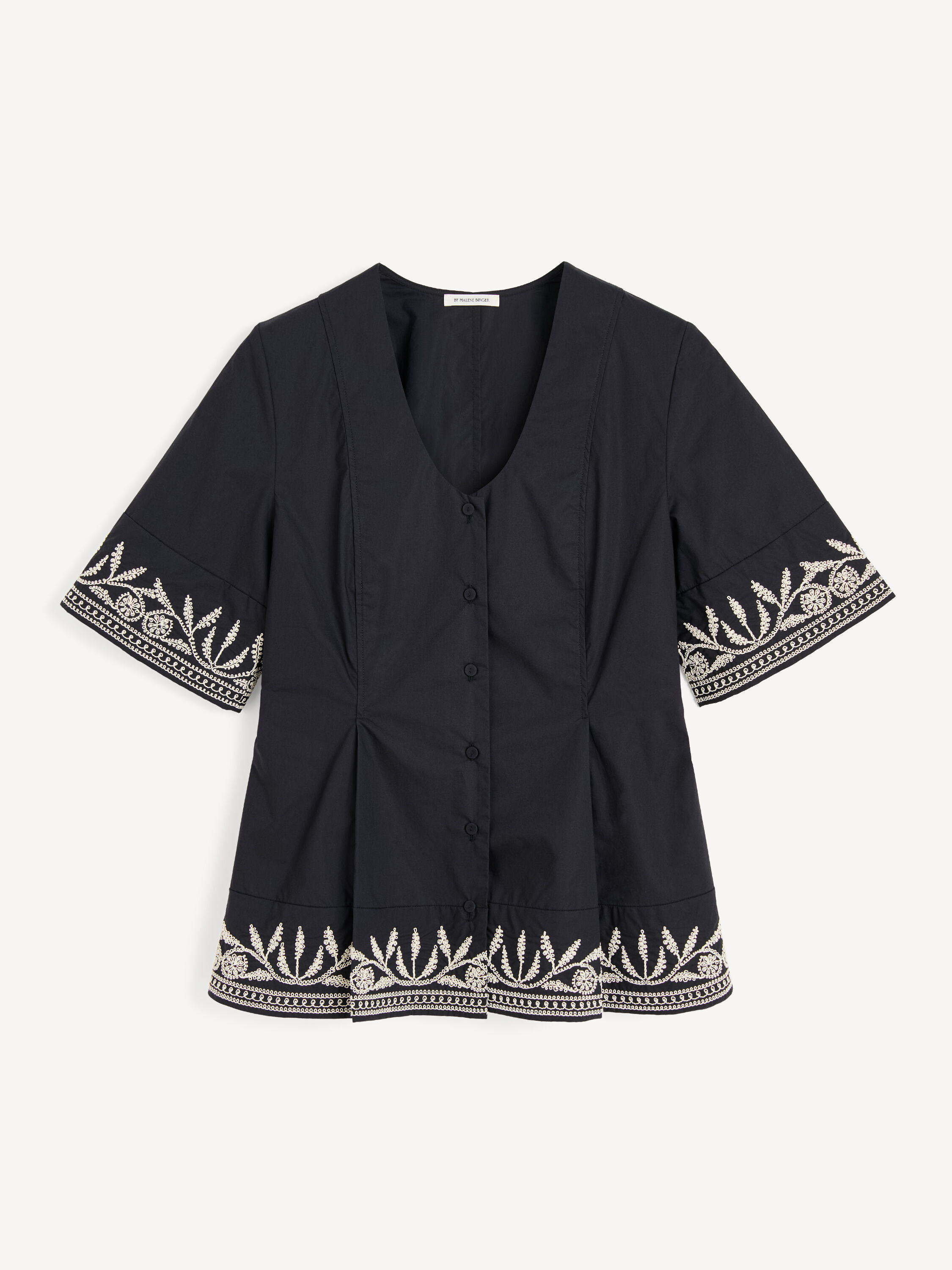 A well-curated wardrobe calls for styles that can be used for a number of occasions, such as the Merlina top. Made in organic cotton, the feminine design has an accentuated waist, button closure and a deep neckline — but the highlight is the neatly embroidered garden vines at the hems. - Regular fit - Model is 179 cm and is wearing a size 36 - Button closure - Accentuated waist - Embroidery details - Deep neckline - Unlined DETAILS COLOUR Black COMPOSITION 100% cotton organic CARE Wash at 30°c PRODUCT CODE Style #103530050