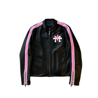 Pink white triple leather cross patch leather jacket