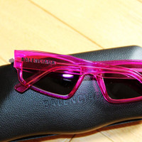 BNWT SS24 BALENCIAGA PINK RECTANGLE FRAME SUNGLASSES ONE SIZE, MADE IN ITALY. BRAND NEW WITH ORIGINAL CASE. Rendered in hot pink, these sunglasses from Balenciaga Eyewear are designed with a rectangle frame. The pair features UV-protective grey tintes lenses and is finished with logo-printed arms for a branded look. hot pink acetate rectangle frame grey tinted lenses UV-protective lenses lens decal logo print at the arm straight arms curved tips These glasses come with a protective case. Composition Outer: Acetate 100%