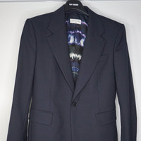 BNWT AW19 DRIES VAN NOTEN BORRIS NAVY JACKET 50 SIZE 50, MADE IN MOROCCO. BRAND NEW WITH TAGS. Long sleeve wool-blend blazer in navy. Notched lapel collar. Button closure at front. Welt pocket at chest. Flap pockets at waist. Partial padding at shoulders. Central vent at back hem. Four-button surgeon's cuffs. Tonal satin lining featuring printed tie-dye-style pattern in tones of white and pink. Supplier color: Navy 55% polyester, 45% wool.