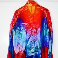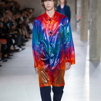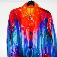 BNWT SS19 DRIES VAN NOTEN x VERNER PANTON ROTARY COAT 48 SIZE 48, MADE IN ROMANIA. BRAND NEW WITH TAGS. Long sleeve translucent coated nylon and silk-blend coat featuring multicolor graphic pattern. Spread collar. Button closure at front. Welt pockets at waist. Central vent at back hem. 55% polyamide, 45% silk. Imported.