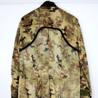 SS13 DRIES VAN NOTEN MILITARY CAMOUFLAGE JACKET 48 SIZE 48. PRE OWNED. WORN 71 TIMES, CONDITION 2/10. The jacket has a flap over Velcro closure at the front as well as a zip, two welt pockets, and one zipped pocket externally. The back of the jacket is made in a lighter almost parachute silk lining. The care label has gone missing but I am assuming the jacket is made from 100% cotton and the lighter back panel from 100% Silk. This is an oversized style and can be worn a size or two smaller or bigger, have a look at the measurements. The overall condition is not bad apart from some decoloration under the zip pocket at the front and lower front lining. These marks accrued when the jacket was last dry cleaned. These marks are not very obvious and kind of blend into the pattern of the jacket, as you can see in the pictures. I have taken this flaw into consideration when pricing the jacket. This jacket is sold as used.