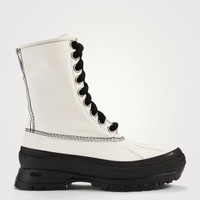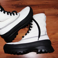 BNWT AW21 JIL SANDER LEATHER COMBAT BOOTS 41 SIZE 41 (WOMEN'S COLLECTION), MADE IN ITALY. BRAND NEW WITH ORIGINAL BOX, DUST BAG. Evoking a utilitarian aesthetic, these leather hiking boots are set atop a Vibram tractor sole. They have large metal eyelets anchoring a lace-up vamp and a logo-branded insole. Upper: Leather; Sole: Rubber Round toe Treaded sole Lace-up closure