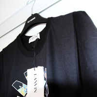 BNWT SS21 LANVIN PRINTED FITTED TSHIRT S SIZE S (WOMEN'S COLLECTION, FITS LIKE MEN'S XS), MADE IN ITALY. BRAND NEW WITH TAGS. “Jeanne Lanvin Hippie” printed crew-neck T-shirt Color: black Exclusive Mother and Child embroidery logo on nape Fitted cut Main material: 100% cotton knit