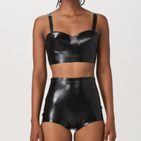 BNWT AW23 MAISON MARGIELA LATEX BALCONETTE BRA 44 SIZE 44, MADE IN ITALY. BRAND NEW WITH TAGS. black patent finish signature four-stitch logo balconette style underwire cup rear press-stud fastening thin shoulder straps straight hem cropped black patent finish signature four-stitch logo balconette style underwire cup rear press-stud fastening thin shoulder straps straight hem cropped Please note that we are unable to accept returns on latex pieces. Composition: Latex 100%