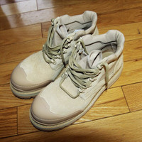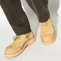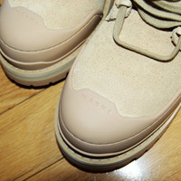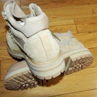 BNWT AW24 MARNI LEATHER SUEDE ANKLE COMBAT BOOTS 43 SIZE 43, MADE IN SPAIN. BRAND NEW WITH ORIGINAL BOX. Presenting the leather ankle boots from the renowned brand Marni, which combine sophistication with functionality. Made from the highest quality suede leather in an elegant beige color, these boots are the perfect choice for those who value luxury and unique style. The boots feature a classic ankle-length design, adding timeless charm. The smooth leather finish on the front and around the heel provides additional durability and a stylish look. With a solid rubber sole featuring a pronounced tread, these boots guarantee excellent grip, even in challenging weather conditions. The side panels include textile inserts that aid ventilation, and the front lacing with metal eyelets adds a striking character to the boots. An additional advantage is the subtle "MARNI" logo embossed on the front part of the sole. The boots are presented on a model, allowing for a better visualization of their appearance in reality. Thanks to the universal beige color, they are a perfect complement to both casual and more formal outfits. High-quality suede and smooth leather Solid rubber sole with pronounced tread Elegant and universal beige color Stylish design with a subtle "MARNI" logo Ideal for various occasions and weather conditions Composition Upper 100% calf leather Contrast 100% cotton Lining 100% calf leather Sole 100% rubber