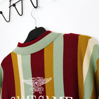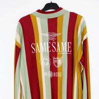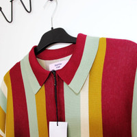 BNWT AW24 MARTINE ROSE SAME SAME VERTICAL STRIPE SWEATER S SIZE S, MADE IN CHINA. BRAND NEW WITH TAGS. pastel green/multicolour fine knit vertical stripe pattern short front zip fastening polo collar long sleeves embroidered logo to the rear long sleeves ribbed cuffs and hem Composition Viscose 52%, Silk 32%, Cotton 13%, Elastane 3%