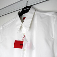 BNWT SS20 HUGO BOSS ELWOOD EXTRA SLIM FIT SHIRT 42 SIZE 42, MADE IN CHINA. BRAND NEW WITH TAGS. A trend-driven shirt by HUGO Menswear, crafted in pure-cotton poplin with easy-iron finishing for low maintenance. Cut to an ultra-narrow fit, this sharp design is topped with a feature collar inspired by music icons of the 1980s. Interior labelling in bold red injects HUGO DNA to this contemporary shirt. Extra-slim fit Kent collar Squared cuffs Standard length