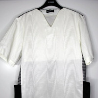 BNWT SS20 NICOMEDE EPISODE 1 GINGHAM MOIRE STRETCH TSHIRT L SIZE L, MADE IN UK. BRAND NEW WITH STORE TAG. Nicomedestretch-jersey tunic Details: V-neck Short sleeves Checked pattern at chest Contrasting panels at sides and back Notched hem Straight hem Pulls on Fabric: 100% polyester; 100% nylon; 100% cotton Lightweight, stretch-jersey Chest 21.26 in 54 cm Length 31.1 in 79 cm Shoulders 19.29 in 49 cm Sleeve Length 11.42 in 29 cm