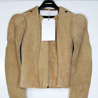 BNWT AW12 MAISON MARGIELA X H&M SUEDE LEATHER JACKET 4 SIZE 4 (EU34), MADE IN CHINA. BRAND NEW WITH TAGS. This a re-edition version from their Spring/Summer 1998 collection. US Women’s Size 4. This item runs small and will be a best fit for a women who typically wears an XS.