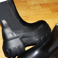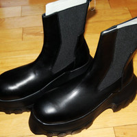 BNWT AW24 RICK OWENS "PORTERVILLE" BEATLE MEGA TRACTOR 44 SIZE 44 (US 11), MADE IN ITALY. BRAND NEW WITH ORIGINAL BOX. RICK OWENS FW24 PORTERVILLE BEATLE MEGA TRACTOR IN BLACK/BLACK WASHED CALF THESE BEATLE MEGA TRACTOR BOOTS ARE ABOVE-ANKLE HEIGHT. THEY HAVE GEOMETRIC SIDE PANELS IN STRETCH ELASTIC, AN ANGULAR HEEL COUNTER WITH TOP STITCHING, A BACK LOOP PULL TAB AND A ROUNDED BOZO TOE. THEY FEATURE A DOUBLE HEIGHT MEGA TRACTOR SOLE. THIS MEDIUMWEIGHT COW LEATHER IS VEG TANNED AND FINISHED USING NATURAL WAXES. A FINAL WASH GIVES THIS LEATHER ITS SOFTNESS AND BRINGS OUT THE NATURAL GRAIN TEXTURE OF EACH SKIN. BECAUSE THIS SKIN IS NAKED, NOT FINISHED USING ANY PIGMENTS COVERING THE SKIN, NATURAL MARKINGS AND SHADINGS ARE VISIBLE WHICH MAKES EACH SKIN AND PRODUCT UNIQUE. VEG TANNING MEANS ONLY VEGETAL AND NATURAL TANNINS WERE USED IN THE PROCESS OF TANNING AND PRESERVING THIS LEATHER. COLOR: BLACK/BLACK MATERIAL: UPPER 100% CALF LEATHER LINING 100% CALF LEATHER INSOLE 100% CALF LEATHER SOLE 100% E.V.A