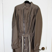BNWT SS21 RICK OWENS "PHLEGETHON" SHORT GARY FLIGHTSUIT 52 SIZE 52, MADE IN ITALY. BRAND NEW WITH STORE TAG. Men's Short Gary Flightsuit from the Rick Owens "Phlegethon" Collection, named after one of the five infernal rivers of the underworld in Greek mythology. This Gary Numan-inspired flightsuit has a below-the-knee length and features a slight drop crotch, a bias zip with snap detail at the bottom, a gathered waist, snap details on the high round collar and cuffs. Rick Owens Phlegethon Collection Short Gary Flightsuit Colour: 34 (Dust) Below-the-Knee Length Asymmetric Zip Closure Slight Drop Crotch Gathered Waist High Collar Four Pockets Silver-Tone Rivet Details Composition: 100% POLYESTER. CHEST 54CM SHOULDER 46CM SLEEVE 73CM LENGTH 123CM