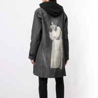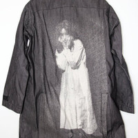 SS20 UNDERCOVER x CINDY SHERMAN DENIM JACKET 2 SIZE 2, MADE IN JAPAN. BRAND NEW WITHOUT TAG. Dark grey cotton single-breasted denim coat from Undercover featuring a print to the rear, a classic collar, a concealed front fastening, two chest pockets, side pockets, long sleeves and a mid-length. Boasting a printed self-portrait of American artist and photographer Cindy Sherman on the back, this A-line coat is like a piece of art. Rugged cotton denim, unlined Hidden button closure Buttoned flap pocket on the chest, side pockets Double slit behind Emblem label Composition Cotton 100% Chest 22.44 in 57 cm Length 37.01 in 94 cm Shoulders 19.29 in 49 cm Sleeve Length 25.59 in 65 cm