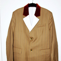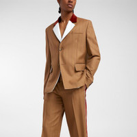 BNWT SS24 WALES BONNER PINSTRIPE WOOL HAILE JACKET 52 SIZE 52, MADE IN ITALY. BRAND NEW WITH STORE TAG. The Wales Bonner label offers a multifaceted aesthetic perspective in a blend of European heritage and Afro-Atlantic influence. This jacket from the spring collection is made of sumptuous virgin wool with rich velvet and immaculate white cotton accents, making it a must-have for summer. Wear it with its matching pant for a flawless outfit. Luxurious 100% virgin wool fabric, delicate lining Velvet accent collar with contrasting cotton underside Two buttons Flap pockets and a small pocket on the chest Centre vent behind Composition Fabric 1 100% virgin wool Fabric 2 100% cotton Lining 100% cotton