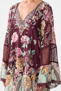The If These Tiles Could Talk A-Line Gathered Panel Dress is a handcrafted silhouette designed by our in house artisans. Reimagined in an exclusive limited edition print, our A line panel dress is cut in relaxed fit and features a v neckline and flared sleeves. It's finished with intricately applied crystal embellishments. - 100% Silk - Relaxed Fit - V Neckline - Flared Sleeve - Lace Contrast SKU 00039496-TILETALK-XXS Size and Fit Our model is 5'10 (178cm) tall and wears a size S (AU 10). Bust: 40in (101.6cm) Waist: 26.5in (67cm) Hips: 38in (96.5cm) Designed as a relaxed fit. Take your normal size, or select one size smaller for a neater fit. Fabric and Care 100% SILK With its subtly textured surface, silk crepe is our core fabrication made perfect for versatile wear. With its ability to hold alternative ways to wear, this decadent fabric drapes elegantly off the body whilst keeping you cool with its breathable nature.
