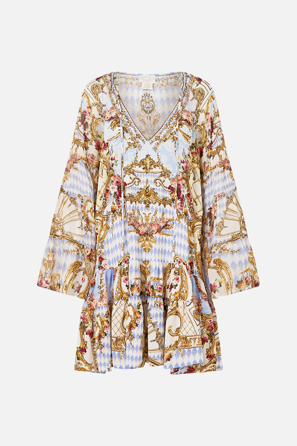 Designed in Australia, The Throne Games A-Line Gathered Panel Dress welcomes you to the Palace of Queluz, where ornate rococo details and fine architectural artistry are framed by an elegant floral border. Lovingly handcrafted, this CAMILLA silk mini dress features an elegant V neckline with delicate tie details. The voluminous swing-shaped body is finished with gathered panel seams followed by a deep ruffle detail upon the hem and flared sleeves. - Crystal Embellishment - V Neckline - Relaxed Fit - Flared Sleeve - Crystal Embellishment - Tassels - Pockets SKU 00033646-THRNGMES-XXS Size and Fit Our model wears a CAMILLA S and is 5'10 (178cm) tall. Her standard dress size is an AU 10. She has a 32in (83cm) bust, 35in (89.5cm) hips and a 25in (66cm) waist. CAMILLA Size S = AU10 / UK10 / US6 Our More to Love Model wears a CAMILLA Size 3XL and is 5'9 (182cm) tall. Her standard dress size is a AU 20. She has a 42in (107cm) bust, 35.8in (91cm) waist and 46in (118cm) hips. CAMILLA Size 3XL = AU20 / UK20 / US16 Designed as a relaxed fit, take your normal size or select one size smaller for a neater fit Fabric and Care 100% SILK With its subtly textured surface, silk crepe is our core fabrication made perfect for versatile wear. With its ability to hold alternative ways to wear, this decadent fabric drapes elegantly off the body whilst keeping you cool with its breathable nature.