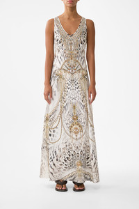 The Lady Lionheart Bias Cut Tank Dress is a handcrafted silhouette designed by our in house artisans. Reimagined in an exclusive limited edition print, our full length tank dress is cut on the bias for a flattering, slim fit. Framed by a rounded v neckline and finished with a front side split, it's an effortless essential made for movement. - 100% Silk - Slim Fit - Full Length - Rounded V Neckline - Front Side Split - Crystal Embellishment SKU 00040970-LADYLION-XXS Size and Fit Our model is 5'10 (178cm) tall and wears a size S (AU 10). Bust: 40in (101.6cm) Waist: 26.5in (67cm) Hips: 38in (96.5cm) Designed and fitted true to size, take your normal size. Fabric and Care 100% SILK Silk satin embodies a sumptuously smooth finish that offers a rich buttery touch to the skin. As a result of the satin weaving technique, it masterfully creates a fuller bounce to the body and drape details.