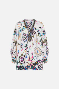 Designed in Australia, The Nubian Wonderland Blouson Blouse With Neck Tie awakens the identity and artistry amidst the Nubian Village with accenting contrasts, vivid embroidery and geometric depictions. Lovingly handcrafted, this blouse radiates luxury with its enchanting crystal embellishments and a V-neckline with delicate ties. The wide yoke details and blouson sleeves are complemented by shirred elastic cuffs and custom tassels, creating an elegant and sophisticated silhouette. - Crystal Embellishment - V Neckline With Ties - Shirred Elastic Cuff - Wide Yoke Details - Blouson Sleeves - Custom Tassels SKU 00031781-NUBINWON-O/S Size and Fit Our model wears a CAMILLA O/S and is 5'10 (178cm) tall. Her standard dress size is an AU 10. She has a 32in (83cm) bust, 35in (89.5cm) hips and a 25in (66cm) waist. Designed as a relaxed fit, take your normal size or select one size smaller for a neater fit Fabric and Care 100% LINEN Grown organically, this lightweight natural fibre offers a timeless aesthetic that adds durability and longevity to any wardrobe. Its breathability keeps your skin cool, minimises moisture and ensures effortless comfort.