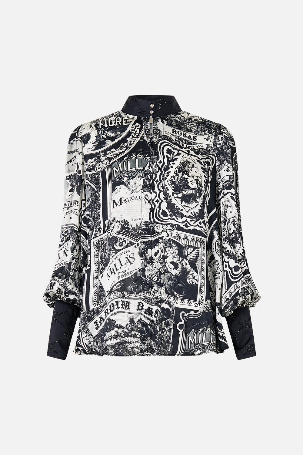 Designed in Australia, the Perfumed In Porto Blouson Sleeve Blouse With Button Collar channels the lively allure of soap-inspired packaging with painterly designs that exude artistry and charm. Lovingly handcrafted, this blouse with blouson sleeves features a high stand collar and wide cuffs with buttons. Crystal embellishments elevate the refined design, creating an opulent silhouette. - High Stand Collar - Blouson Sleeves - Wide Cuff With Buttons - Crystal Embellishment SKU 00034970-PERFPORT-XS Fabric and Care 100% SILK Silk satin embodies a sumptuously smooth finish that offers a rich buttery touch to the skin. As a result of the satin weaving technique, it masterfully creates a fuller bounce to the body and drape details.