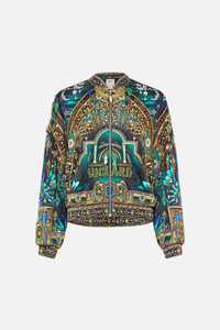 Encompassing 150 hours of masterful craftsmanship, this exquisite bomber jacket is adorned with an intricate array of glass beads, bugles, crystal chains, and rhinestones, each element heightening its inherent elegance. Accented with hotfix stones to enhance its shimmer, it transcends mere luxury, emerging as a statement piece that gleams with the mystique of the fabled Emerald City. Designed in Australia, The Defy Gravity Bomber Jacket beckons you to the decadently enchanted land of Oz, where opulent gold embellishments and extravagant borders cascade through a bewitching realm, intertwining with dazzling greens and teals. Lovingly handcrafted, this bomber jacket exudes luxury with its dazzling crystal embellishments and encased elastic cuffs and hem, ensuring a tailored silhouette. Fully lined for an indulgent feel, it also features sophisticated front pockets, seamlessly combining opulence with functionality. - Crystal Embellishment - Encased Elastic Cuffs And Hem - Fully Lined - Front Pockets - Hand Embroidery SKU 00036365-ELPHABAJ-XS Size and Fit Our model wears a CAMILLA S and is 5'10 (178cm) tall. Her standard dress size is an AU 10. She has a 32in (83cm) bust, 35in (89.5cm) hips and a 25in (66cm) waist. Camilla S = AU10 / UK10 / US6 Designed and fitted true to size, take your normal size. Fabric and Care 100% SILK Silk satin embodies a sumptuously smooth finish that offers a rich buttery touch to the skin. As a result of the satin weaving technique, it masterfully creates a fuller bounce to the body and drape details.